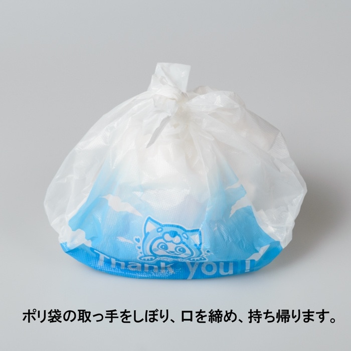 取っ手がついてるから結びやすく、手で持ちやすい。ポリ袋をひっくり返すと、かわいいデザイン。うんちの入った水溶性の紙袋だけ取り出し、トイレに流せます。