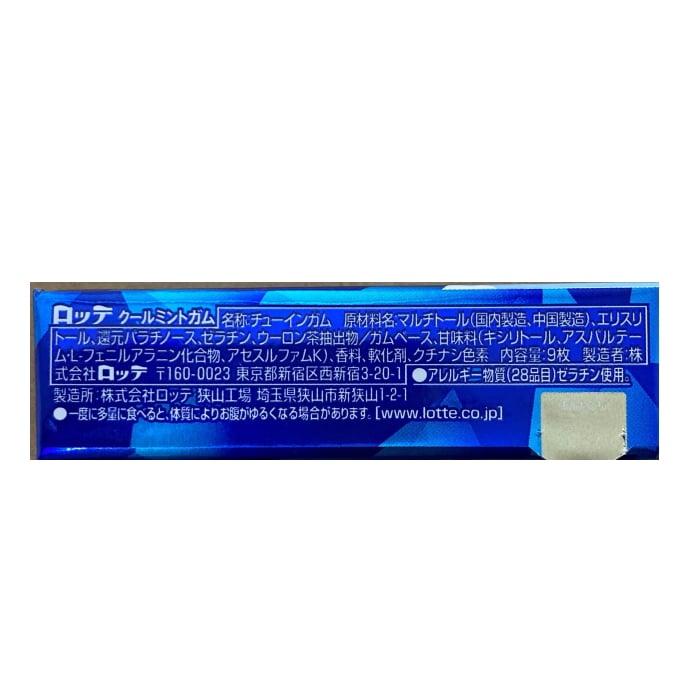 原材料名:マルチトール(外国製造)/甘味料(キシリトール、アスパルテーム・L-フェニルアラニン化合物)、ガムベー ス、香料、増粘剤(アラビアガム)、光沢剤、リン酸一水素カルシウム、フクロノリ抽出物、着色料(紅花黄、 クチナシ)、ヘスペリジン、(一部にゼラチンを含む)