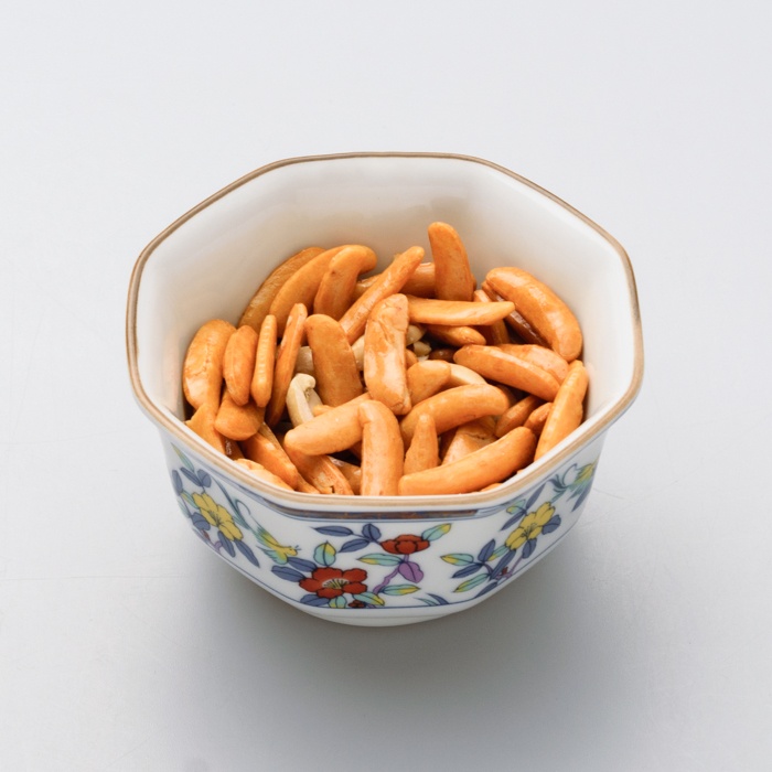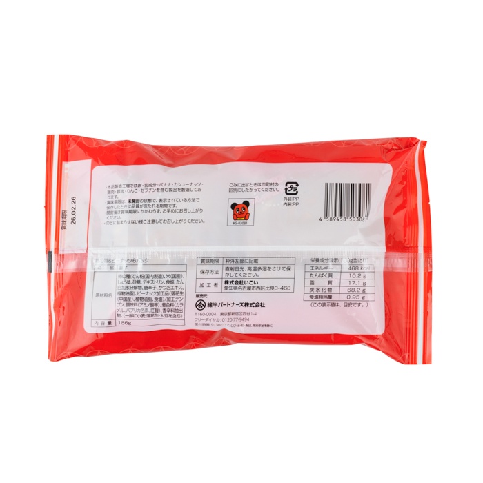 原材料名:柿の種(でん粉(国内製造)、米(国産)、しょうゆ、砂糖、デキストリン、食塩、たん白加水分解物、唐辛子、かつおエキス、植物油脂)、ピーナッツ加工品(落花生(中国産)、植物油脂、食塩)/加工デンプン、調味料(アミノ酸等)、着色料(カラメル、パプリカ色素、紅麹)、香辛料抽出物、(一部に小麦・落花生・大豆を含む)