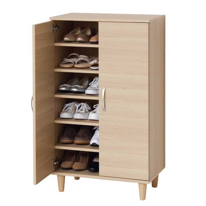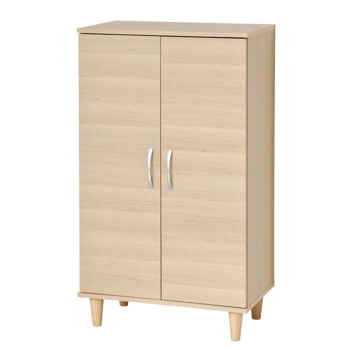 天然木製のおしゃれな脚付き。 底板の下は約11cmの空間があり、湿気がこもりにくく靴を置くこともできます。 扉はモダンな横木目柄でスライドヒンジを使用。 上下連結可能(連結・転倒防止部品付)
