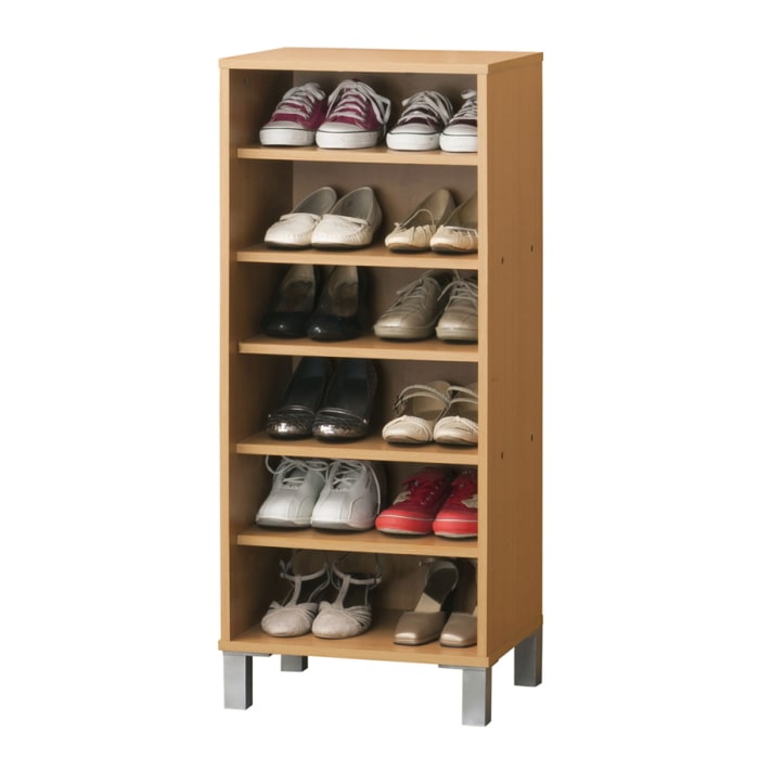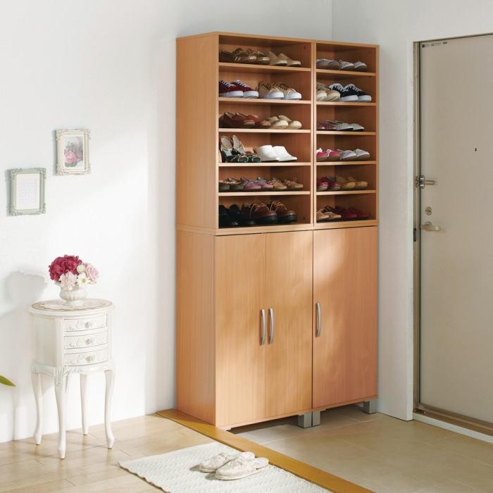 靴は最大12足収納可能。固定棚2枚・可動棚3枚付なので、靴の高さに合わせて棚の位置を変えることができ、ショートブーツ(高さ約29cmまで)なども収納可能。背面は化粧仕上げ。脚を外せば2台積み重ねることができるので、収納力がアップします。(連結金具付)