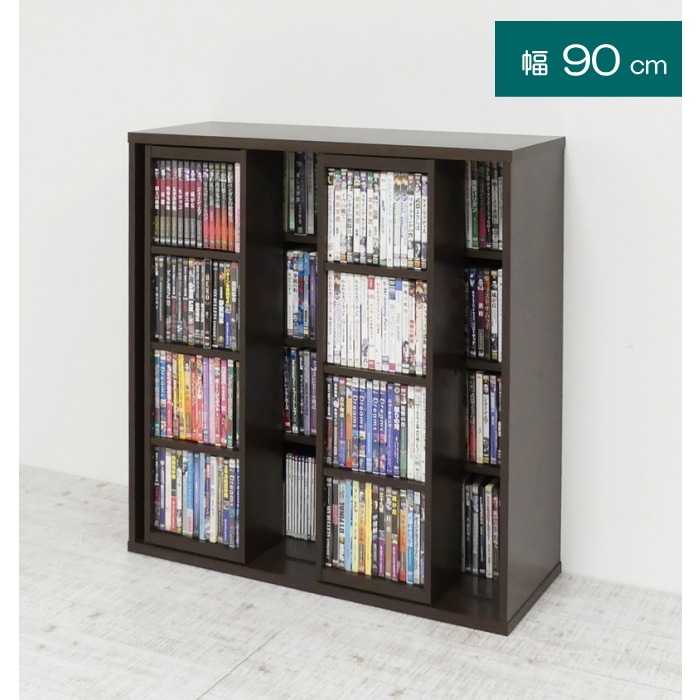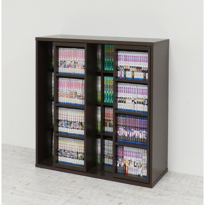 後ろの棚の本も取り出しやすい前面スライド式。連結金具付で、2台積み重ねることもできます。奥の棚1列にCD41枚・DVD28本・コミック本27冊、スライド棚1列ににCD21枚・DVD15本・コミック本14冊、収納できます。