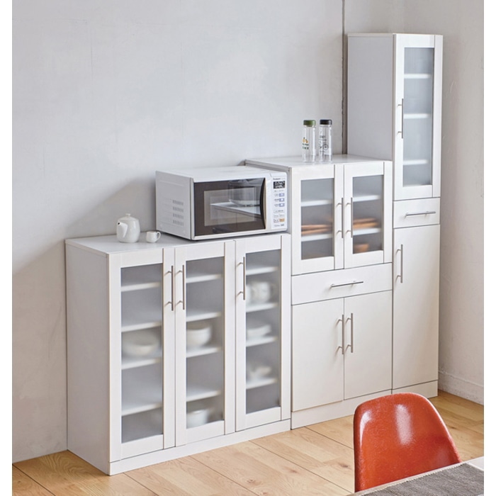 ホワイトカラーがお部屋を明るくします。幅30cmですので、狭いすきまにも収まります。前板にポリ板を使用しているので、ちょっとした汚れもお手入れ簡単です。ミストガラス使用。