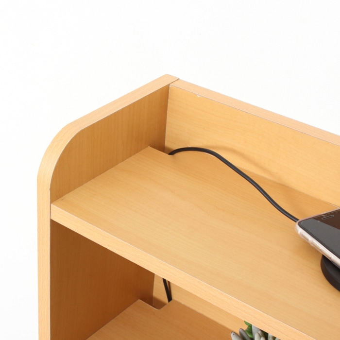 置くだけの簡単設置。ヘッドレスベッドやマットレスの枕元に収納スペースができます。 フラップ棚と前板は、ベッドの高さに合わせて4段階で位置を変えられます。 天板から下の配線収納部までコードを通すスペースがあり、フラップ棚内部はタップや配線を隠してすっきり収納できます。