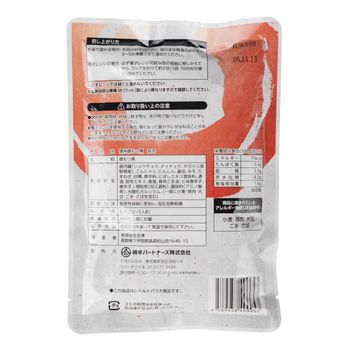 原材料名 : 豚内臓(ショウチョウ(長野県産)、ダイチョウ、サガリ)、こんにゃく、