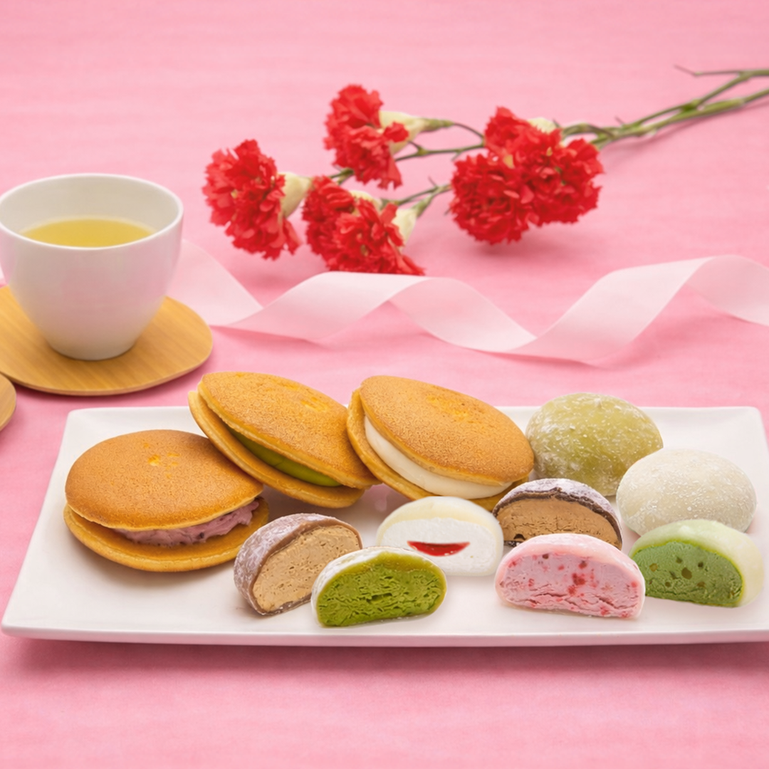 | セット内容 | ・とろける抹茶生大福×1個 ・とろける苺生大福×1個 ・とろける珈琲生大福×1個 ・とろけるほうじ茶生大福×1個 ・とろけるピスタチオ生大福×2個 ・とろけるストロベリーチーズ生大福×2個 ・生どら焼<抹茶>×1個 ・生どら焼<あずき>×1個 ・生どら焼<レアチーズ>×1個 ・母の日カード×1枚 ・ミニカーネーション(造花)×1本(長さ約10.5cm) |