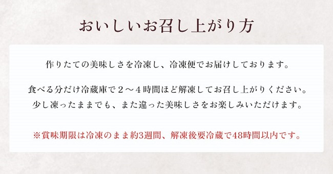 | 賞味期限 | 冷凍のままで約3週間、解凍後冷蔵庫で48時間 |