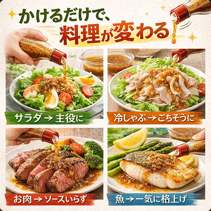 原材料名:たまねぎ(国産)、しょうゆ、食用植物油脂(菜種油、オリーブオイル)、砂糖、醸造酢、昆布エキス/アルコール、増粘多糖類、(一部に小麦・大豆を含む)