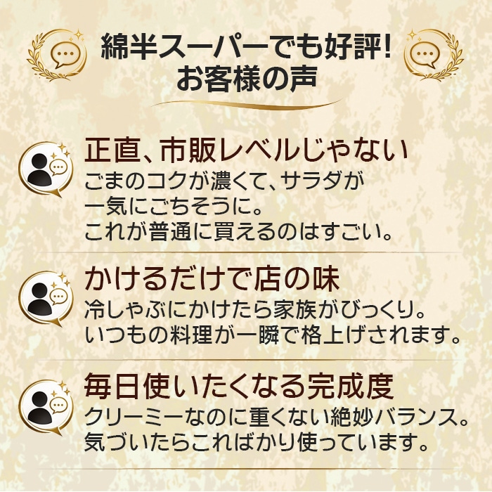 原材料名:食用菜種油(国内製造)、砂糖、ねりごま、ごま、しょうゆ、本みりん、たん白加水分解物、卵黄、醸造酢、食塩、にんにく、豆板醤/アルコール、増粘多糖類、( -部に卵・小麦・大豆・ごまを含む)