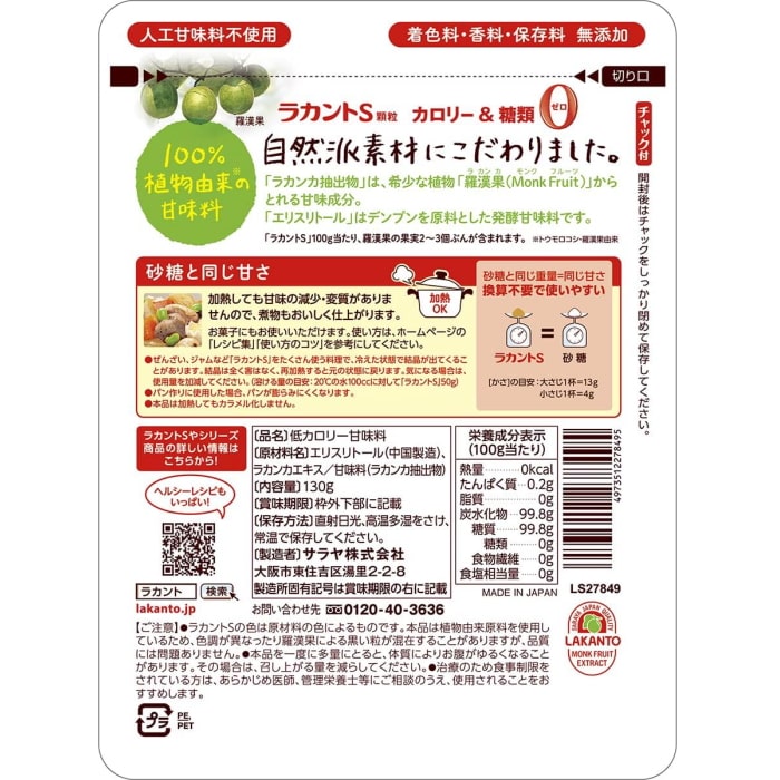 原材料名:エリスリトール(中国製造・遺伝子組み換えでない)、ラカンカエキス、甘味料(ラカンカ抽出物)
