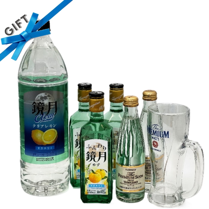 焼酎の中でも圧倒的な人気を誇るサントリーの「鏡月」のクリアレモンとゆずに炭酸水とジョッキグラスまでついたセットです。