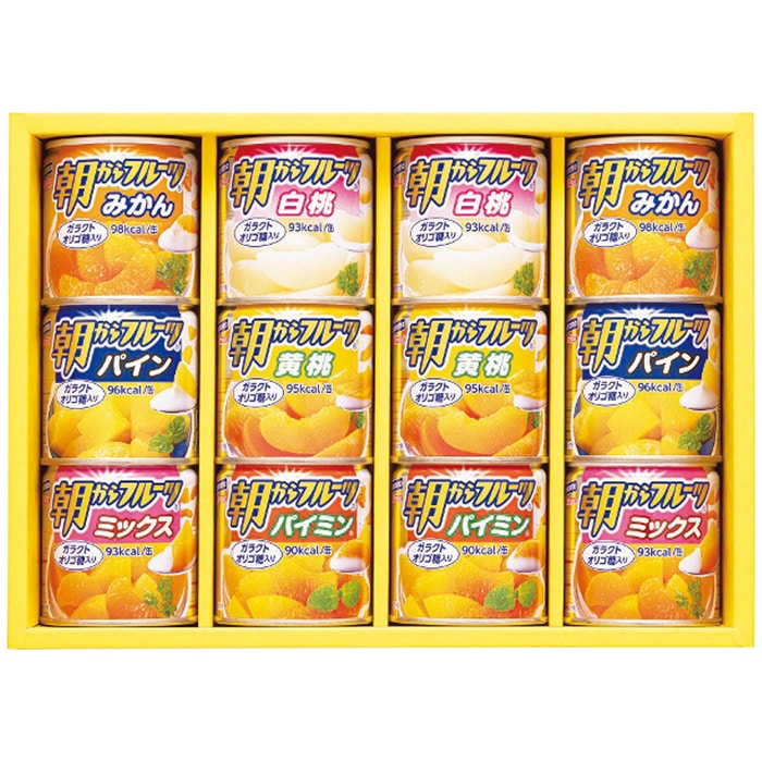 内容:朝からフルーツ190g(みかん・パイン・ミックス・パイミン・黄桃・白桃各2缶)