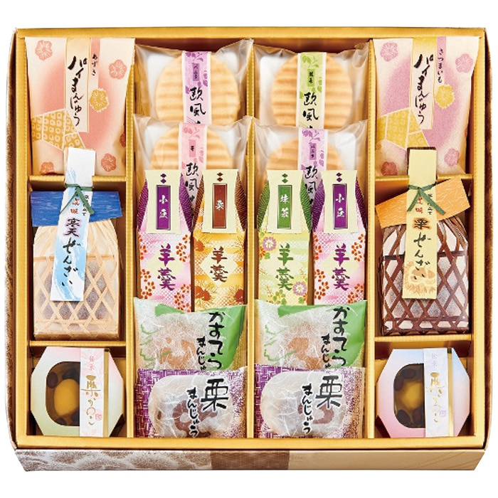 内容:欧風せんべい(バニラ2個・苺・抹茶各1個)・パイまんじゅう(あずき・さつまいも各1個)・栗まんじゅう・カステラまんじゅう・栗かのこ80g各2個・ようかん60g(小豆2個・栗・抹茶各1個)・寒天ぜんざい120g(小豆・栗各1個)