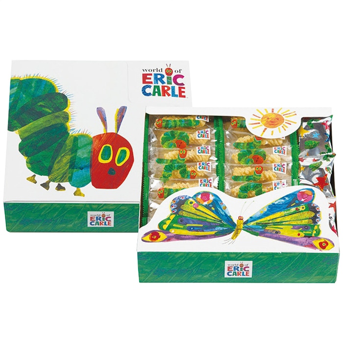 絵本「はらぺこあおむし」をモチーフにしたひねり揚げのギフトです、パッケージが絵本のページをめくるようです。