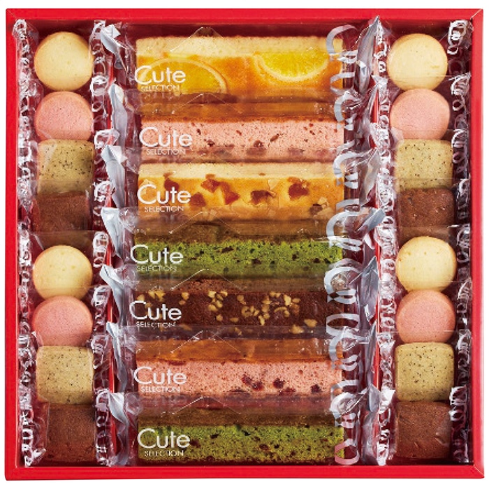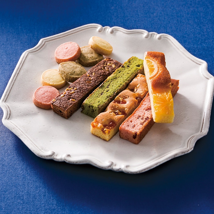 内容:ケーキ(オレンジ・キャラメルアップル各1個・ミックスベリー・抹茶ショコラ各2個)・ニューヨークブラウニー1個・クッキー(ショコラ・ストロベリー・アールグレイ・レモン各4個)