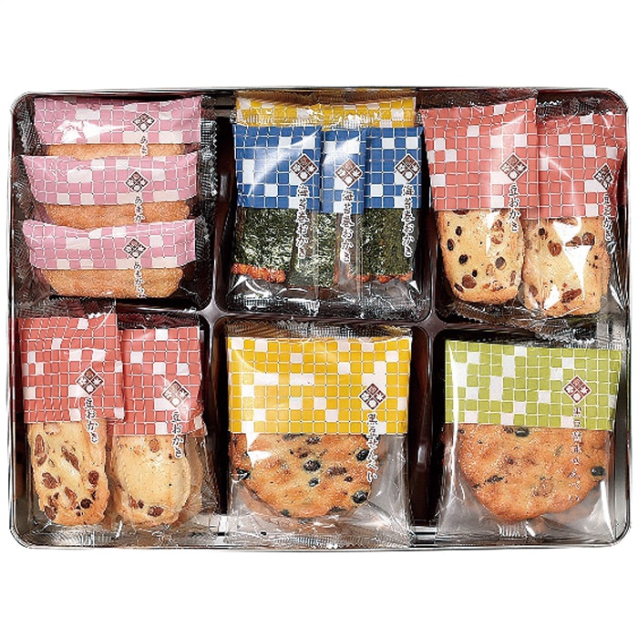内容:あまからせん(2枚入)・黒豆せんべい(1枚入)各8袋・黒豆醤油せん(1枚入)5袋・豆おかき(1枚入)10袋・海苔巻おかき(1枚入)3袋