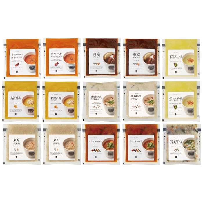 内容:オマール海老のビスク・東京ボルシチ・とうもろこしとさつま芋のスープ・東京参鶏湯・焼き鯛だしの和風スープ・ミネストローネ・北海道産かぼちゃのスープ各2個・生姜とオクラのミネストローネ1個・各180g