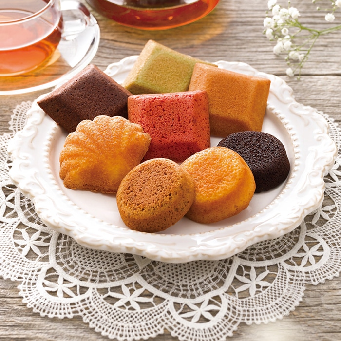 内容:マドレーヌ・フィナンシェ・ケーキ(チョコオレンジ・メープルアーモンド・いちごバター・りんごバター)各3個・フィナンシェ(ショコラ・ピスタチオ各2個)