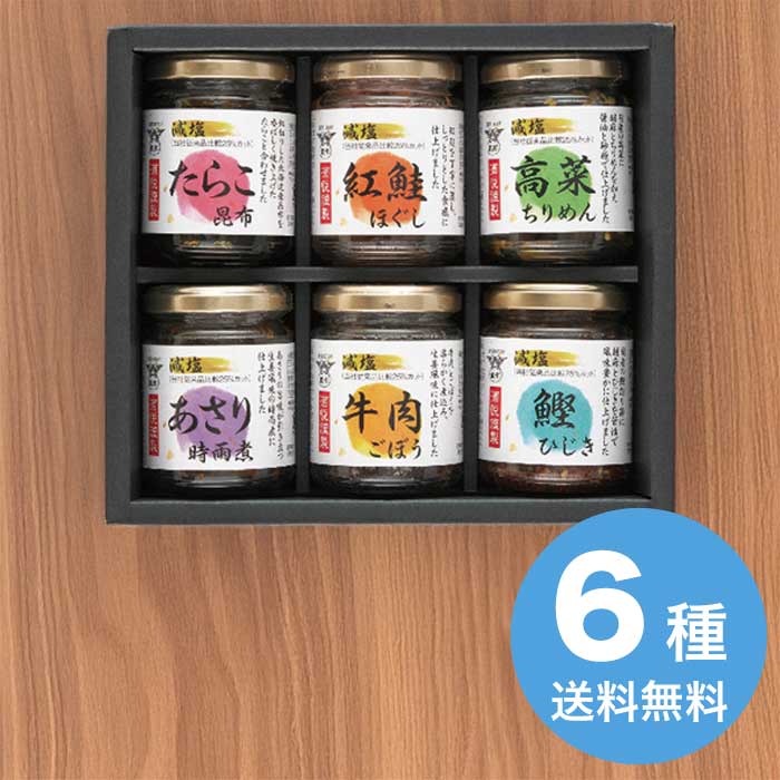 内容:減塩(牛肉ごぼう60g・紅鮭ほぐし80g・高菜ちりめん80g・あさり時雨煮65g・たらこ昆布55g・鰹ひじき50g各1瓶)