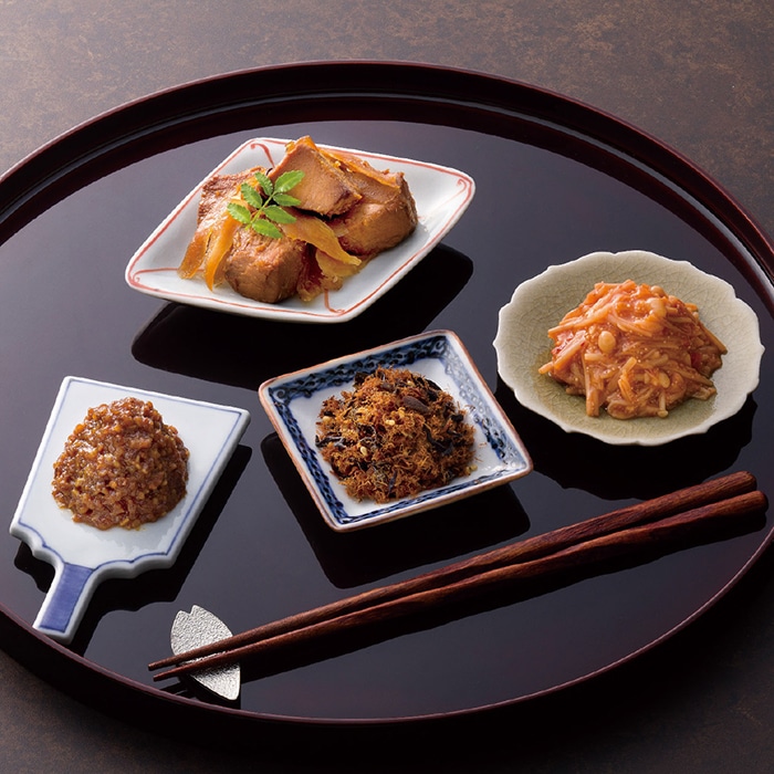 あめ色になるまでじっくりと炊き合わせ、お互いの旨みを充分に吸わせたきんぴらまぐろは、お子様からご年配の方まで幅広く人気の一品。そのまま酒の肴として、おにぎりの具にしても美味しくお召し上がりいただけます。木箱入りで目上の方への贈りものにもオススメです。