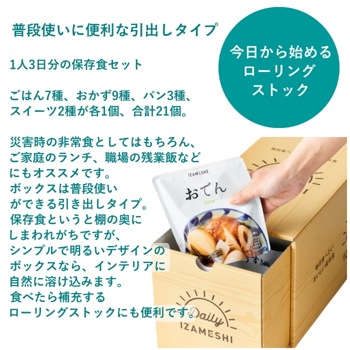 「デイリーイザメシ」は1人3日分の保存食セット。ごはん7種、おかず9種、パン3種、スイーツ2種が各1個、合計21個入っています。災害時の非常食としてはもちろん、ご家庭のランチ、職場の残業飯などにも。ボックスは普段使いができる引き出しタイプ。保存食というと棚の奥にしまわれがちですが、シンプルで明るいデザインなので、インテリアに自然に溶け込みます。食べたら補充するローリングストックにも便利です。大切な人の「いざ」の場面で活躍する「イザメシ」は、贈り物にもおすすめです。