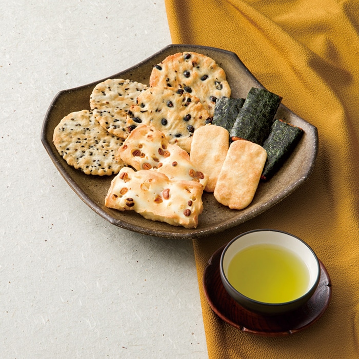 内容:あまからせん(2枚入)・胡麻せんべい(1枚入)・黒豆せんべい(1枚入)各5袋・豆おかき(1枚入)6袋・海苔巻おかき(1枚入)3袋