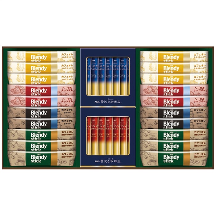 内容:ブレンディスティック(カフェオレ14g×6本・カフェオレ(ミルクたっぷり14g×6本・甘さなし11.4g×4本)・ヘーゼルナッツオレ11g×4本)・ちょっと贅沢な珈琲店スティックブラック(ブラジルブレンド2g・モカブレンド2g各7本)