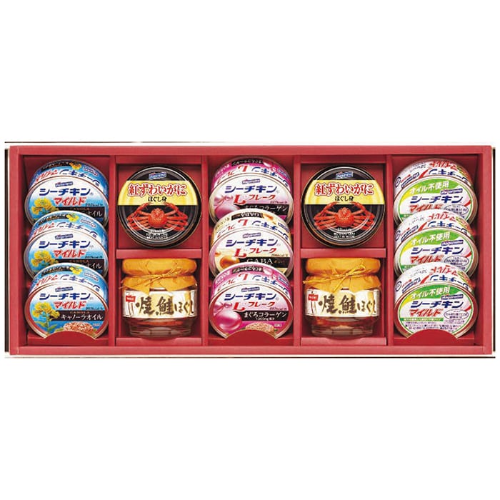 内容:シーチキンマイルドキャノーラ・オイル不使用シーチキンマイルド各3缶・シーチキンLフレークコラーゲン入り2缶・シーチキンLフレークGABA入り1缶・各70g・紅ずわいがにほぐし身55g×2缶・焼鮭ほぐし50g×2瓶