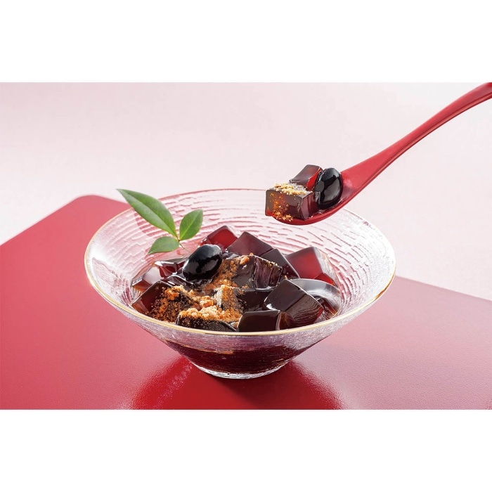北海道産黒豆と黒蜜を使ったわらび餅。一人前にちょうど良いサイズで、つるんとした食感が特徴です。きな粉をかけてお召し上がりください。