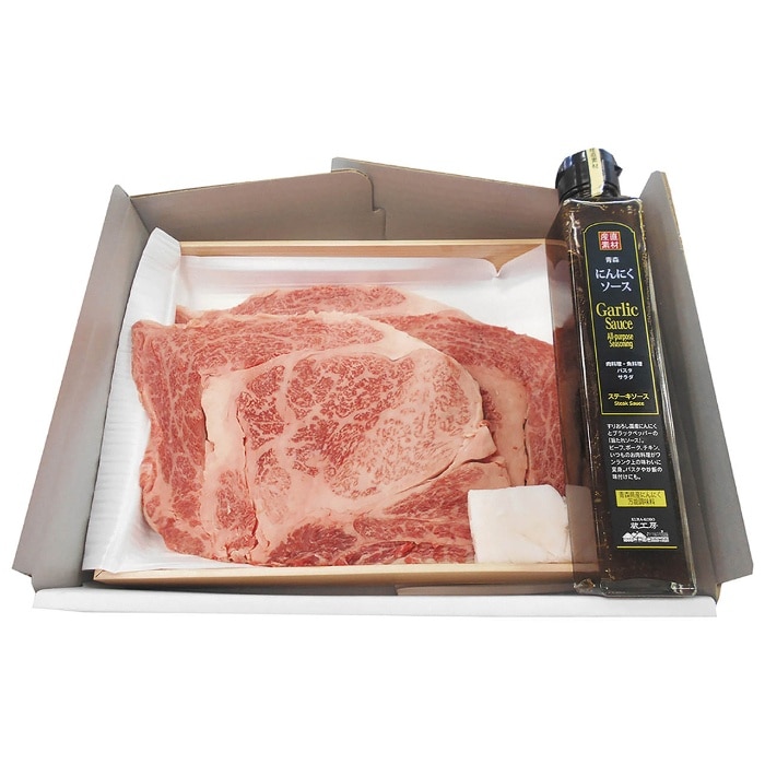 内容:ロースステーキ3枚(計600g)、(A-4等級以上/証明書付き)、二反田醤油にんにくソース200ml