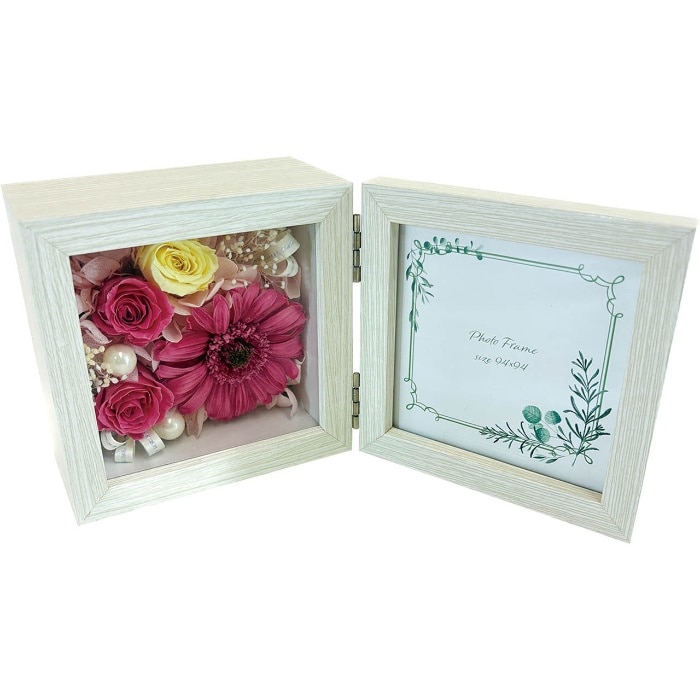 プリザーブドフラワーのボックスアレンジと、写真やカードをセットして飾れます。 色褪せない思い出とお花、あなただけの特別なギフト