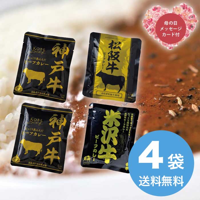 内容:ビーフカレー(中辛)160g×4(神戸牛×2、松阪牛、米沢牛×各1)