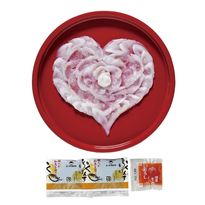 熟練の職人が丁寧にハートの形に盛付けた天然まふくの刺身です。ふくの奥深く豊かな味わいがハートの中に感じられる贈り物に最適なひと品です。