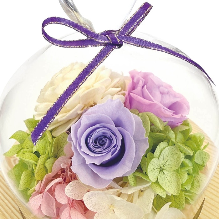 内容:プリザーブドフラワー、ドライフラワー、フローラルフォーム、リボン、ガラス、木