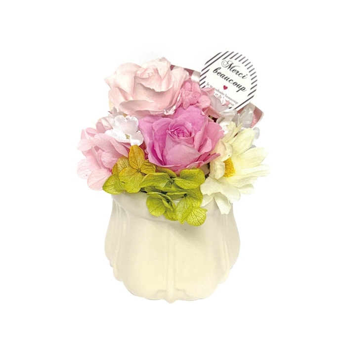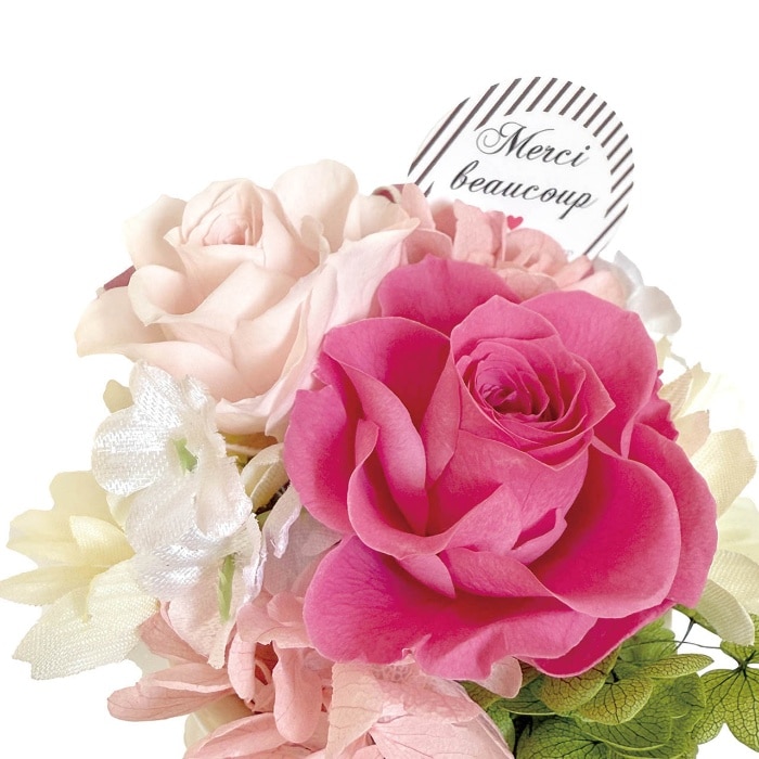 ふんわりとしたボリューム感が魅力のプリザーブドフラワーアレンジメント。ピックには"Meruci"(フランス語でありがとう)のメッセージ入りです。
