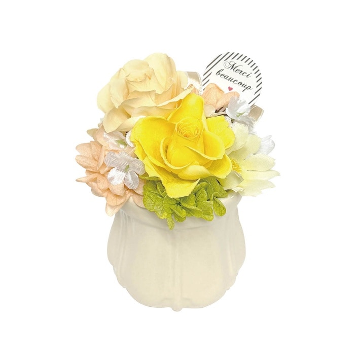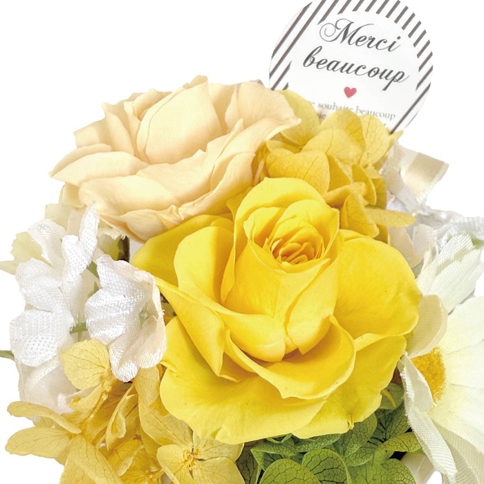 ふんわりとしたボリューム感が魅力のプリザーブドフラワーアレンジメント。ピックには"Meruci"(フランス語でありがとう)のメッセージ入りです。