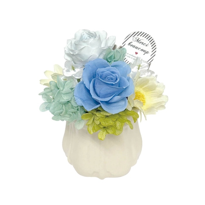 ふんわりとしたボリューム感が魅力のプリザーブドフラワーアレンジメント。ピックには"Meruci"(フランス語でありがとう)のメッセージ入りです。