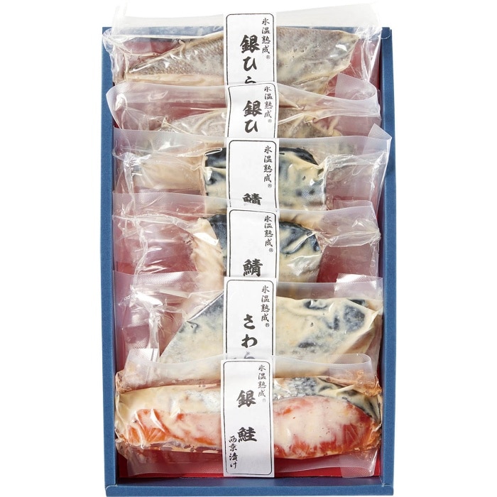 内容:銀ひらす西京漬け60g×2、鯖西京漬け60g×2、銀鮭西京漬け60g×1、さわら西京漬け70g×1