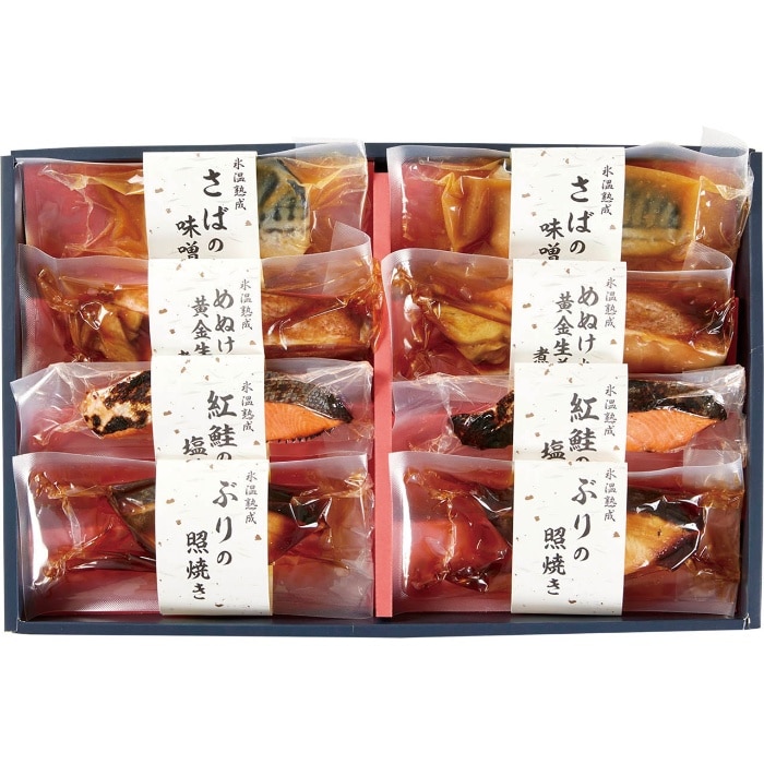 内容:めぬけと黄金生姜の煮付け100g×2、さばの味噌煮90g×2、紅鮭の塩焼き60g×2、ぶりの照焼き90g×2