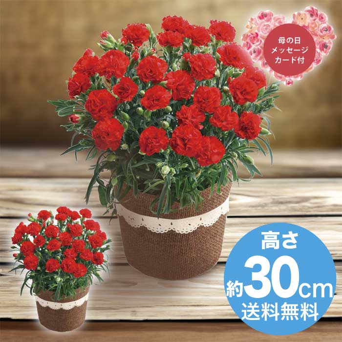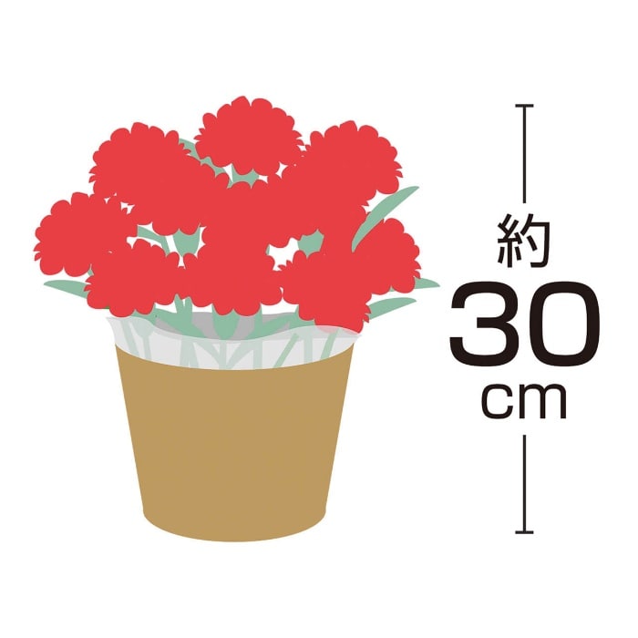 内容:カーネーション(感謝の気持ち)5号1鉢、高さ:約30cm、バスケットもしくはラッピングバッグ、取扱いの手引き