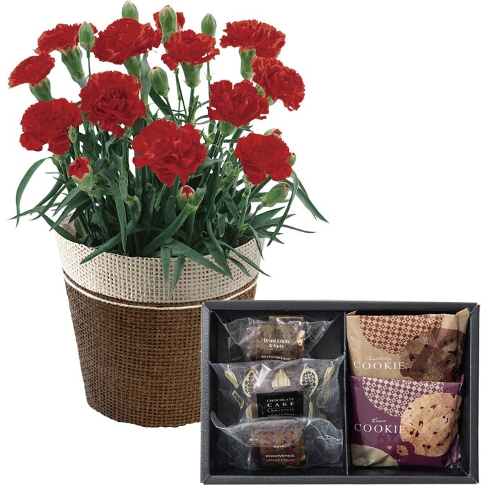 内容:カーネーション(レッド)4号1鉢、サイズ:高さ:約20cm、バスケットもしくはラッピングバッグ、ホテルオークラ ケーキ&ブラウニー&クッキーアソート(レーズンクッキー、チョコチップクッキー、ブラウニーネーブル、ブラウニードライフルーツ&ナッツ、チョコレートケーキ×各1個)