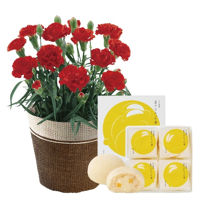 内容:カーネーション(レッド)4号1鉢、サイズ:高さ:約20cm、バスケットもしくはラッピングバッグ、月でひろった卵(4個入)