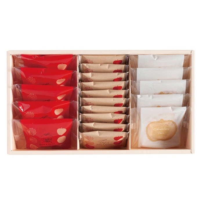 しっとりしたりんごのフィナンシェとサクサク食感のりんごのクッキー、りんご型のチョコレートタルト、3種類のりんごのお菓子がセットになったギフト。