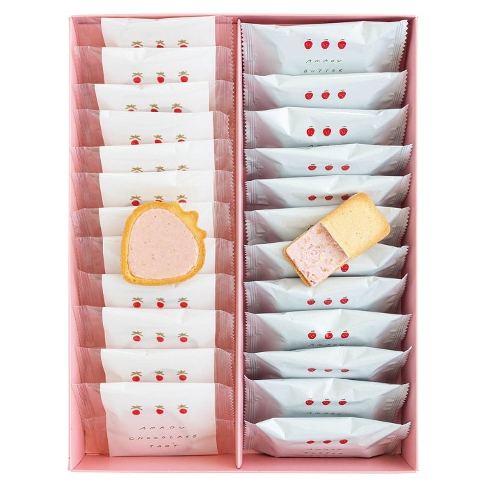 可愛らしい焼き菓子、バターサンドクッキーとチョコタルト、2種類の苺のお菓子がセットになったギフト