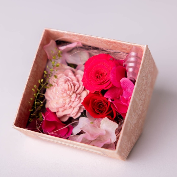 内容:完熟いちごロール1本(約16cm)、プリザーブドフラワー(直径約9cm×高さ約7.5cm)