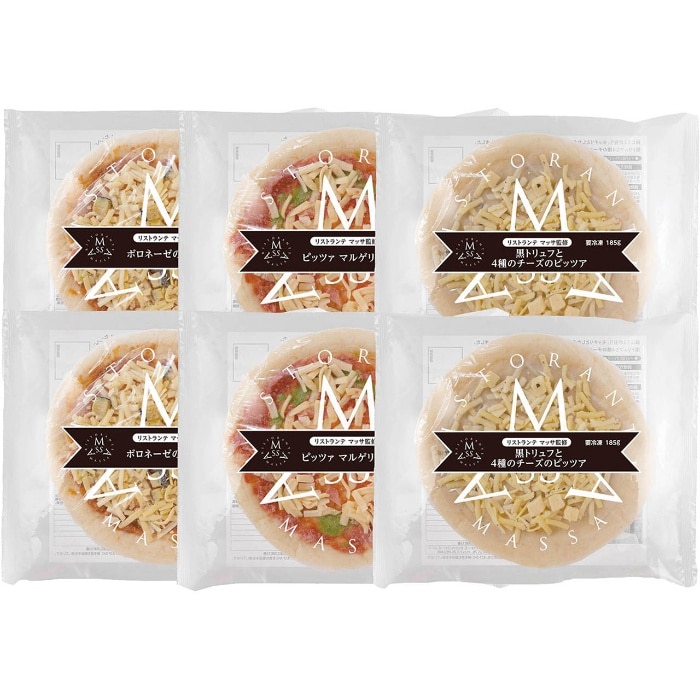 内容:黒トリュフと4種のチーズのピッツァ185g、ボロネーゼのピッツァ204g、ピッツァマルゲリータ205g 各8インチ×2枚