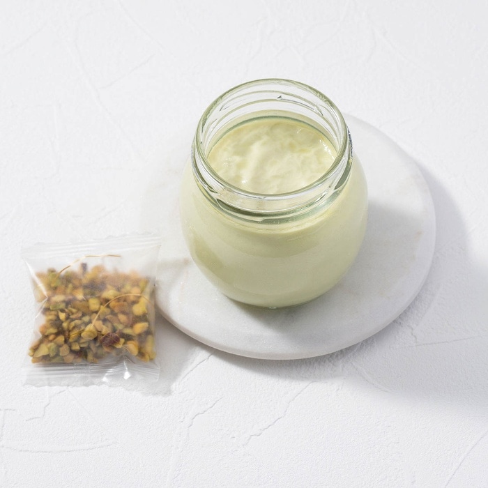 殻を剥いたピスタチオが持つ、奥深いグリーンと上品なピンクの色ムラから醸しでる風味を活かしたなめらかなプリンにダイスクラッシュしたピスタチオをあわせて食感も楽しめるよう工夫しました。