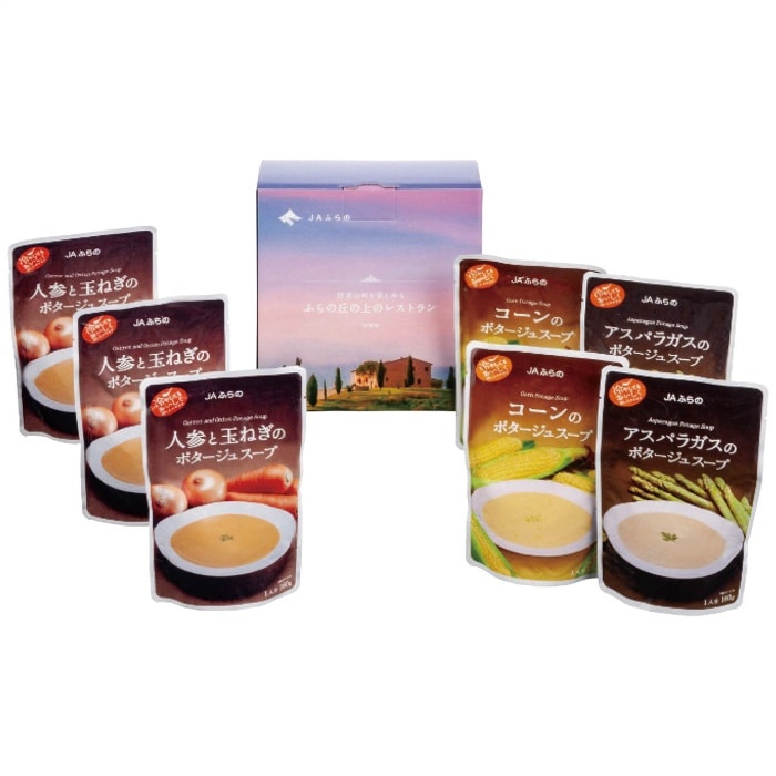 北海道産とうもろこし、アスパラガス、人参、玉ねぎを使用した、濃厚でコクのある贅沢なポタージュの詰合せです。