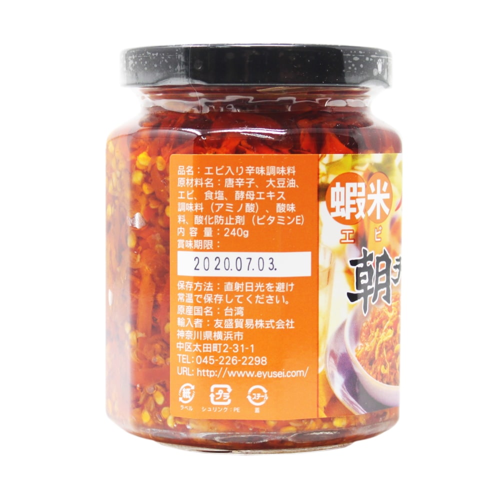 原材料名:唐辛子、 大豆油、 エビ、 食塩、酵母エキス 調味料(アミノ酸)、酸味 料、酸化防止剤(ビタミンE)
