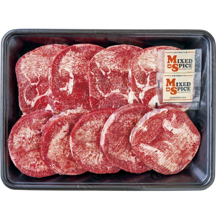 内容量:牛タンステーキ 550g、牛タン焼肉用(タレ漬け)550g、ミックススパイス(小袋付)